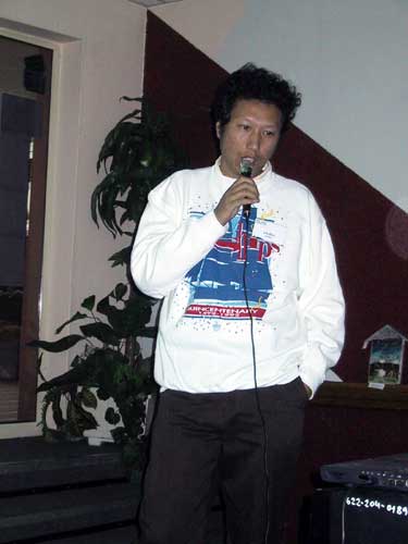 Lunch at the 2002 IMC, Jos Nijland and Jin Zhu exchanging presents (credit Casper ter Kuile).
