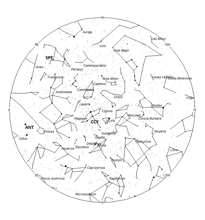 | chi Cygnids (CCY) | Sep 14 | 20:00 (300) +31 | 19 | 22:00 | <1 – <1 | IV |