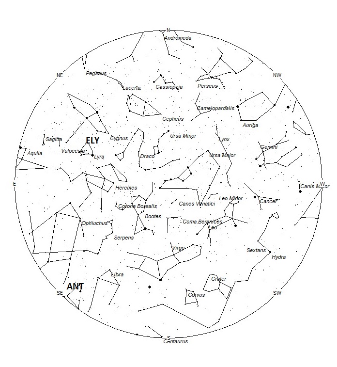 The radiant (the area of the sky where meteors appear to shoot from) positions and rates listed below are exact for Saturday night/Sunday morning May 10/11. These positions do not change greatly day to day so the listed coordinates may be used during this entire period. Most star atlases (available online and at bookstores and planetariums) will provide maps with grid lines of the celestial coordinates so that you may find out exactly where these positions are located in the sky. I have also included charts of the sky that display the radiant positions for evening, midnight, and morning. The center of each chart is the sky directly overhead at the appropriate hour. These charts are oriented for facing south but can be used for any direction by rotating the charts to the desired direction. A planisphere or computer planetarium program is also useful in showing the sky at any time of night on any date of the year. Activity from each radiant is best seen when it is positioned highest in the sky, either due north or south along the meridian, depending on your latitude. Radiants that rise after midnight will not reach their highest point in the sky until daylight. For these radiants, it is best to view them during the last few hours before dawn. It must be remembered that meteor activity is rarely seen at its radiant position. Rather they shoot outwards from the radiant, so it is best to center your field of view so that the radiant lies toward the edge and not the center. Viewing there will allow you to easily trace the path of each meteor back to the radiant (if it is a shower member) or in another direction if it is sporadic. Meteor activity is not seen from radiants that are located far below the horizon. The positions below are listed in a west to east manner in order of right ascension (celestial longitude). The positions listed first are located further west therefore are accessible earlier in the night while those listed further down the list rise later in the night.
