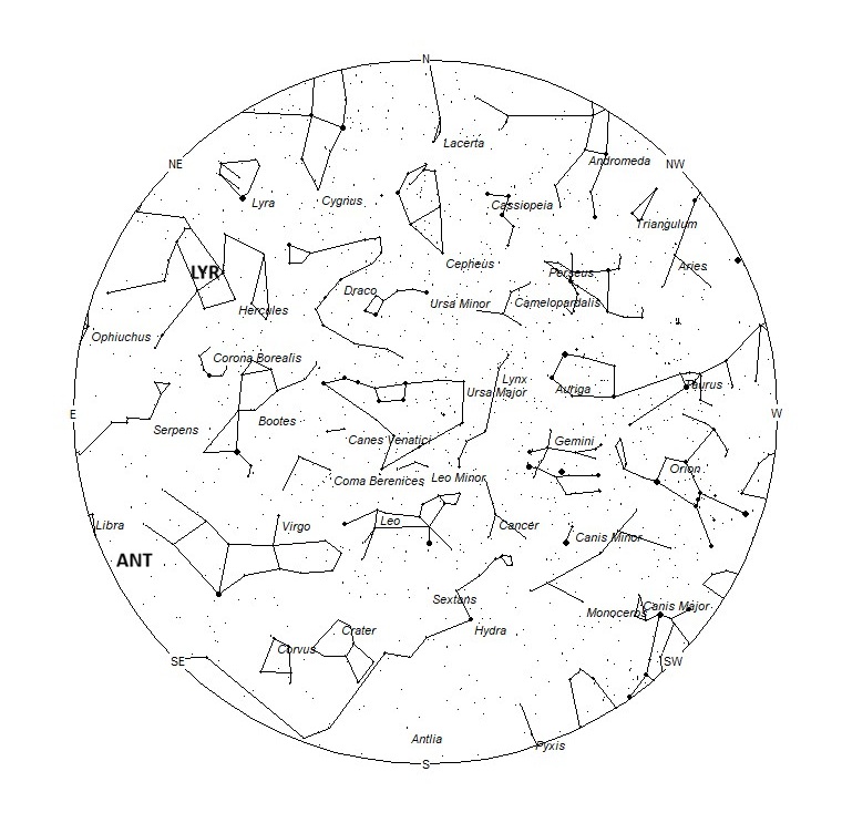 The radiant (the area of the sky from which meteors appear to originate) positions and rates listed below are exact for Saturday night/Sunday morning, April 11/12. These positions do not change greatly from day to day, so the listed coordinates may be used throughout this entire period. Most star atlases (available online, in bookstores, and at planetariums) include maps with celestial coordinate grids that can help you locate these positions in the sky.