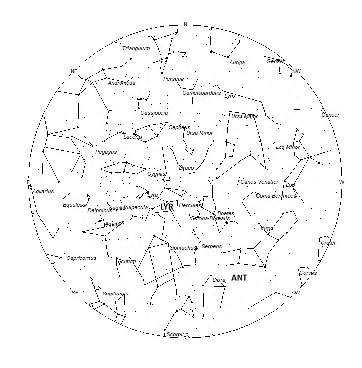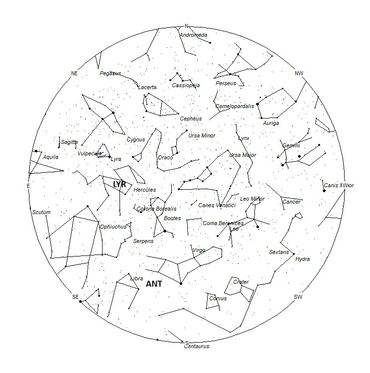 I have also included charts of the sky that display the radiant positions for evening, midnight, and morning. The center of each chart represents the sky directly overhead at the corresponding hour. These charts are oriented for facing south but can be used for any direction by rotating them accordingly. A planisphere or planetarium app is also useful for showing the sky at any time of night on any date of the year.