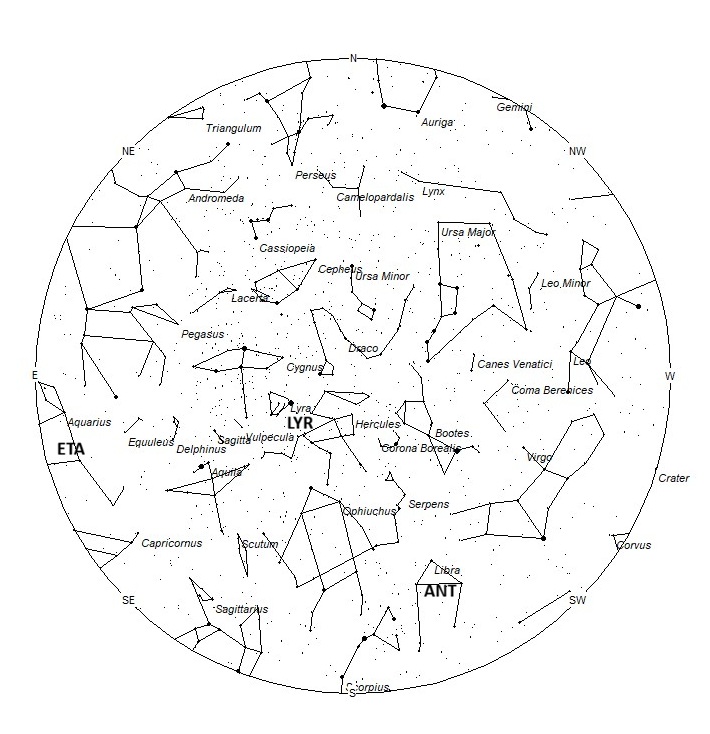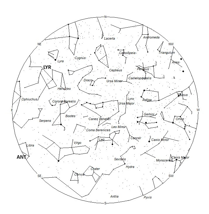 I have also included charts of the sky that display the radiant positions for evening, midnight, and morning. The center of each chart represents the sky directly overhead at the corresponding hour. These charts are oriented for facing south but can be used for any direction by rotating them accordingly. A planisphere or planetarium app is also useful for showing the sky at any time of night on any date of the year.