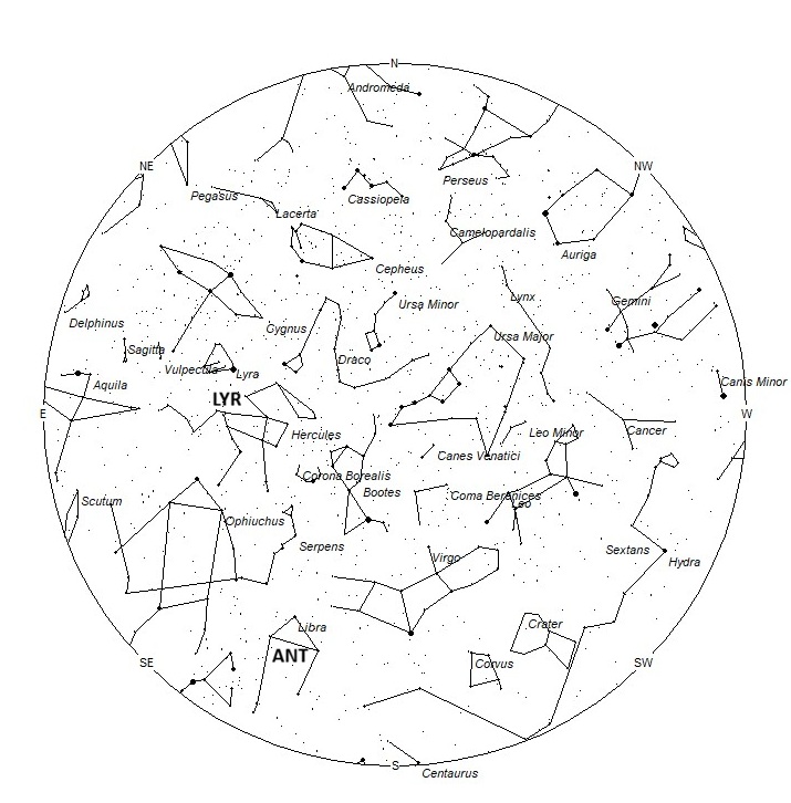 The Lyrids (LYR) are active from April 17-26 and expected to reach maximum activity on April 22nd. The radiant is currently located at 17:52 (268) +34. This area of the sky is located in eastern Hercules, 3 degrees south of the 4th magnitude star known as theta Herculis. This radiant is best placed during the last hour before dawn when it lies nearly overhead. Rates this weekend will be near 2 as seen from the Northern Hemisphere and 1 as seen from south of the equator. With an entry velocity of 46 km/sec., the average meteor from this source would be of medium velocity.