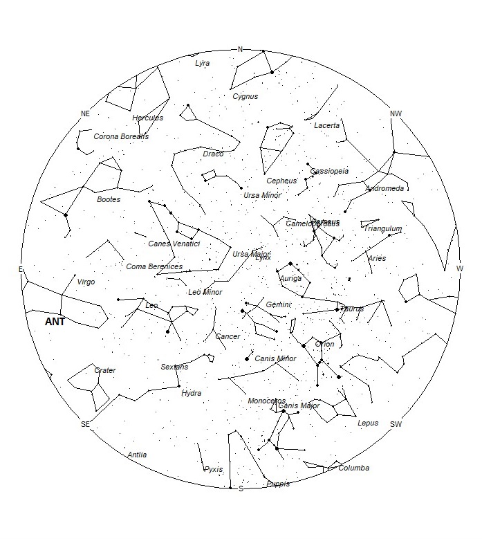 The radiant (the area of the sky where meteors appear to shoot from) positions and rates listed below are exact for Saturday night/Sunday morning March 19/20. These positions do not change greatly day to day so the listed coordinates may be used during this entire period. Most star atlases (available at science stores and planetariums) will provide maps with grid lines of the celestial coordinates so that you may find out exactly where these positions are located in the sky. I have also included charts of the sky that display the radiant positions for evening, midnight, and morning. The center of each chart is the sky directly overhead at the appropriate hour. These charts are oriented for facing south but can be used for any direction by rotating the charts to the desired direction. A planisphere or computer planetarium program is also useful in showing the sky at any time of night on any date of the year. Activity from each radiant is best seen when it is positioned highest in the sky, either due north or south along the meridian, depending on your latitude. It must be remembered that meteor activity is rarely seen at the radiant position. Rather they shoot outwards from the radiant, so it is best to center your field of view so that the radiant lies at the edge and not the center. Viewing there will allow you to easily trace the path of each meteor back to the radiant (if it is a shower member) or in another direction if it is sporadic. Meteor activity is not seen from radiants that are located far below the horizon. The positions below are listed in a west to east manner in order of right ascension (celestial longitude). The positions listed first are located further west therefore are accessible earlier in the night while those listed further down the list rise later in the night.