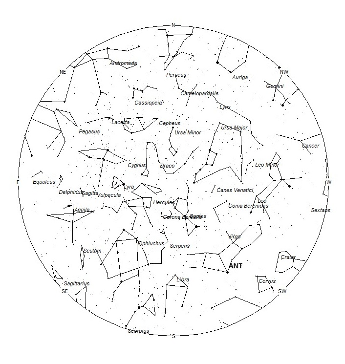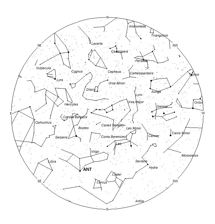 The center of the large Anthelion (ANT) radiant is currently located at 12:56 (194) -06. This position lies in central Virgo, 2 degrees southwest of the 4th magnitude star known as theta Virginis. This radiant is best placed near 0100 local standard time (LST), when it lies on the meridian and is located highest in the southern sky. Rates at this time should be near 2 per hour no matter your location. With an entry velocity of 30 km/sec., the average Anthelion meteor would be of slow velocity.