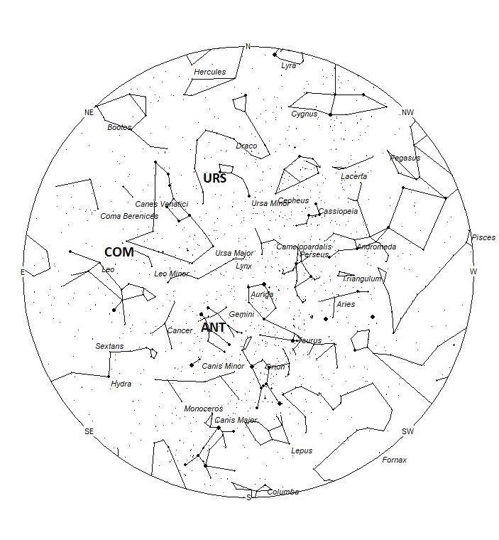 The Comae Berenicids (COM) are a long duration shower active from December 5th through February 4th. Maximum activity occurs on December 16th. The radiant is currently located at 11:00 (165) +28, which places it in eastern Leo Minor, 5 degrees southwest of the 3rd magnitude star known as Alula Borealis (nu Ursae Majoris). These meteors would be best seen near 05:00 LST, when the radiant lies highest in the eastern sky. Current rates should be near 1 per hour as seen from the northern hemisphere and less than one as seen from south of the equator. At 63km/sec., these meteors would produce mostly swift meteors.