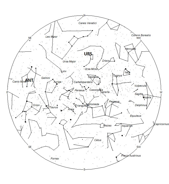 The Ursids (URS) are active from a radiant located at 14:50 (217) +74. This area of the sky is located in southern Ursa Minor, 1 degree south of the 4th magnitude star known as 5 Ursae Minoris. The Ursids are active from December 13-24, with maximum activity occurring on the 22nd. Current rates are expected to be less than 1 per hour. At 33km/sec., these meteors are of medium velocity. Due to the high northern location, these meteors are not visible from the southern hemisphere.