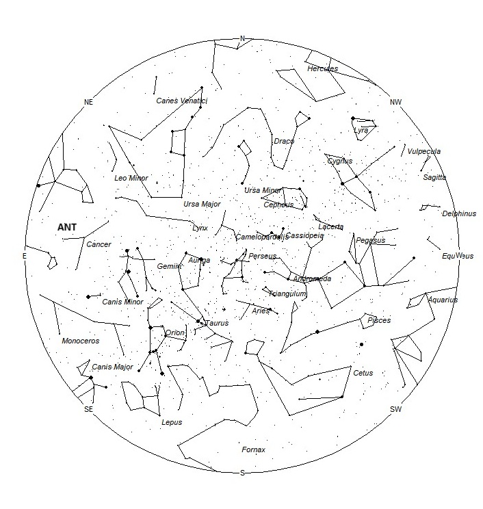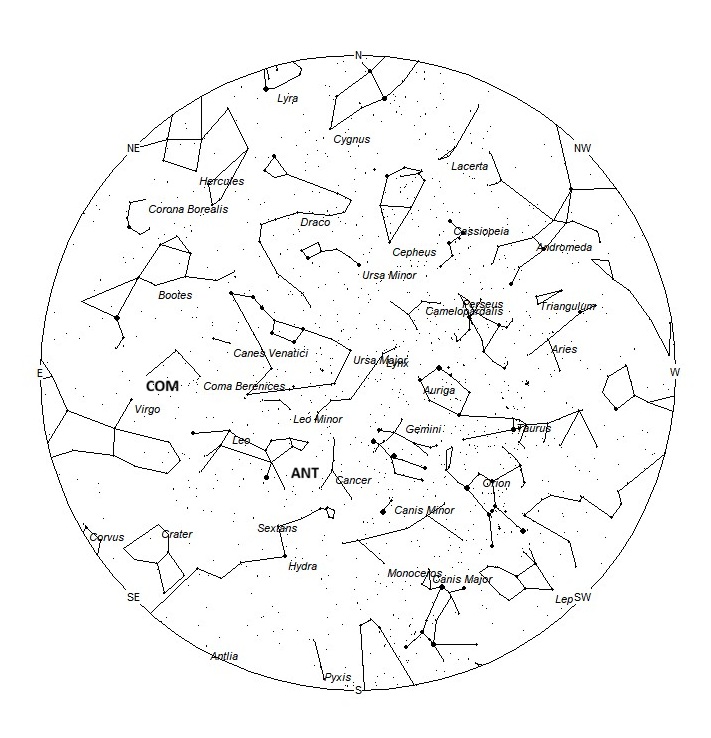 The large Anthelion (ANT) radiant is currently centered at 09:12 (138) +15. This position lies in eastern Cancer, 3 degrees northeast of the 4th magnitude star known as Acubens (alpha Cancri). This radiant is best placed near 01:00 local standard time (LST) when it lies on the meridian and is highest in the southern sky. Rates at this time should be near 3 per hour as seen from the northern hemisphere and 2 per hour as seen from south of the equator. With an entry velocity of 30 km/sec., the average Anthelion meteor would be of medium-slow velocity.