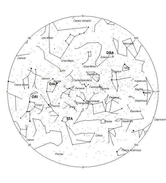 The delta Aurigids (DAU) are active from October 10-18 with maximum activity occurring on October 11th. At maximum the radiant is located at 05:36 (084) +44. This position is located in central Auriga, 4 degrees southeast of the brilliant zero magnitude known as Capella (alpha Aurigae). This radiant is best placed during the last hour prior to dawn, when it lies highest above the horizon in a dark sky. Rates at maximum are expected to be near 1 per hour. With an entry velocity of 64 km/sec., the average DAU meteor would be of swift velocity.