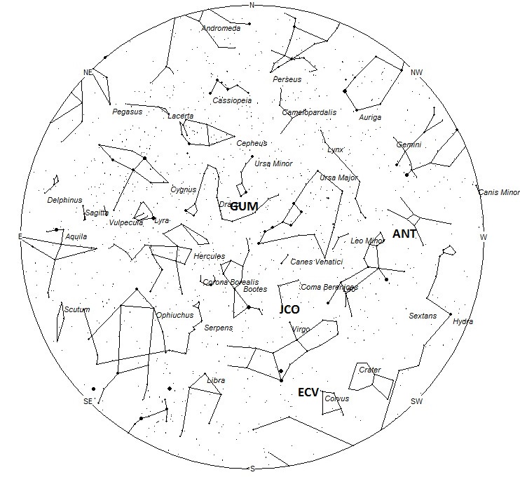 The January Comae Berenicids (JCO) were first detected by Dr. Peter Jenniskens and mentioned in his book: Meteor Showers and their Parent Comets. These meteors are best seen from January 21-27 with maximum occurring on the 24th. At maximum the radiant is located at 12:52 (193) +15. This position lies in southern Coma Berenicids, 5 degrees northwest of the 3rd magnitude star known as Vindemiatrix (Epsilon Virginis). Hourly rates during this period would be less than 1 no matter your location. These meteors are best seen near 0400 LST, when the radiant lies highest above the horizon. These meteors encounter the atmosphere at 65 km/sec., which would produce meteors of swift velocity.